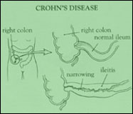 Crohn's disease is a chronic, recurrent inflammatory disease of the intestinal tract. The intestinal tract has four major parts: the esophagus, or food tube; the stomach, where food is churned and digested; the long, small bowel, where nutrients, calories, and vitamins are absorbed; and the colon and rectum, where water is absorbed and stool is stored. The two primary sites for Crohn's disease are the ileum, which is the last portion of the small bowel (ileitis, regional enteritis), and the colon (Crohn's colitis). The condition begins as small, microscopic nests of inflammation which persist and smolder. The lining of the bowel can then become ulcerated and the bowel wall thickened. Eventually, the bowel may become narrowed.